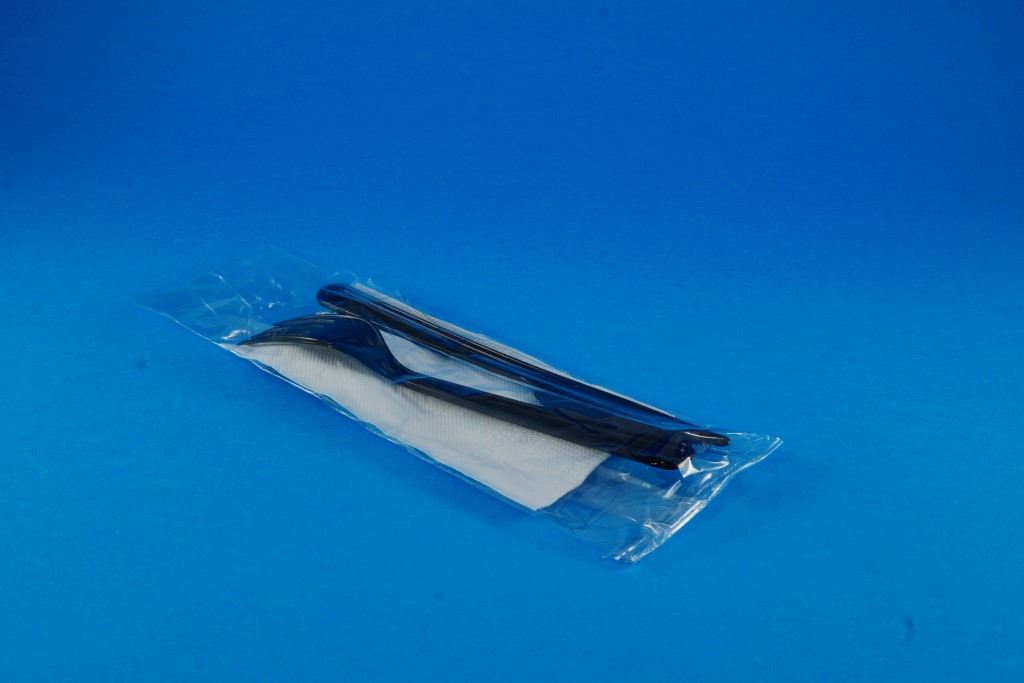 Κουβέρ το οποίο περιέχει χαρτοπετσέτα και μαχαίρι – πιρούνι κατασκευασμένα από μαύρο, σκληρό πλαστικό.